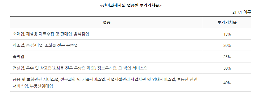 간이과세자의 부문별 부가가치율은 다음과 같습니다.